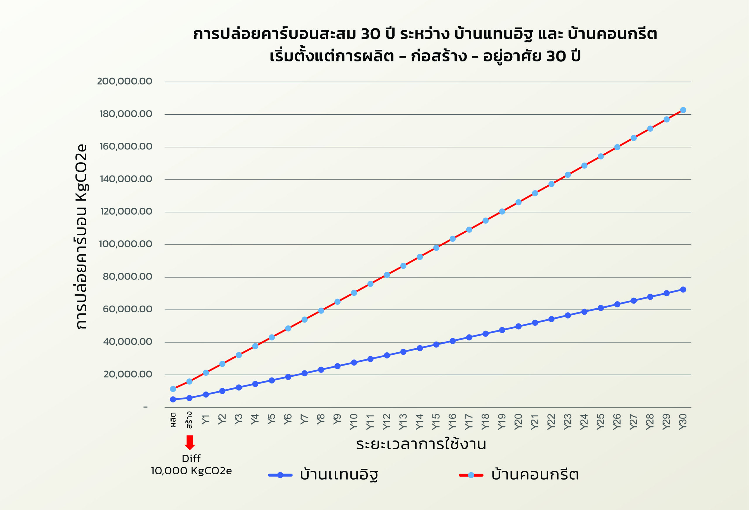 กราฟแสดงปริมาณการปล่อยคาร์บอนสะสม(KgCO2e) ตลอด 30 ปีตั้งแต่การผลิต, ก่อสร้าง, และอยู่อาศัยเปรียบเทียบระหว่างบ้านที่สร้างด้วยแผ่นโครงสร้างสำเร็จรูปกันความร้อนTANNIT MICRO-PRECAST (บ้านแทนอิฐ: เส้นสีน้ำเงิน) และบ้านที่สร้างด้วยคอนกรีต(บ้านคอนกรีต: เส้นสีแดง)